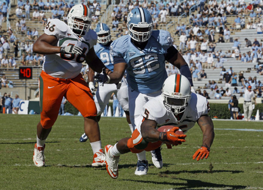 The Canes and Heels traded back-to-back defensive stands, with Miami again bowing up and making another fourth down stop. With 4:38 remaining, the Canes turned to Lamar Miller, who carried five straight times. On 4th-and-8, Jake Wieclaw booted his third field goal of the day and Miami was up 30-17 with just over two to play.